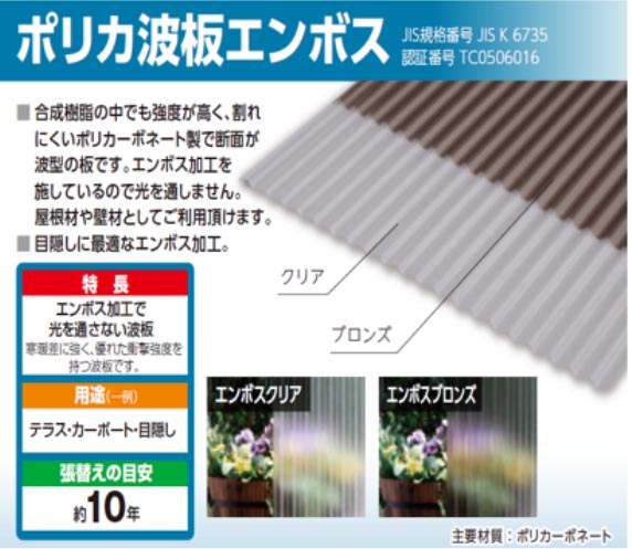 合成樹脂の中でも強度が強く、割れにくいポリカーボネート製の波板です。